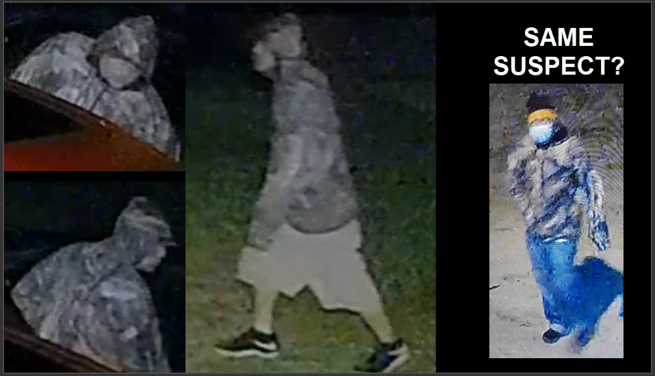 The suspect is seen wearing (ironically) a camouflaged hoodie and dark Nike shoes. He appears to be a white male.