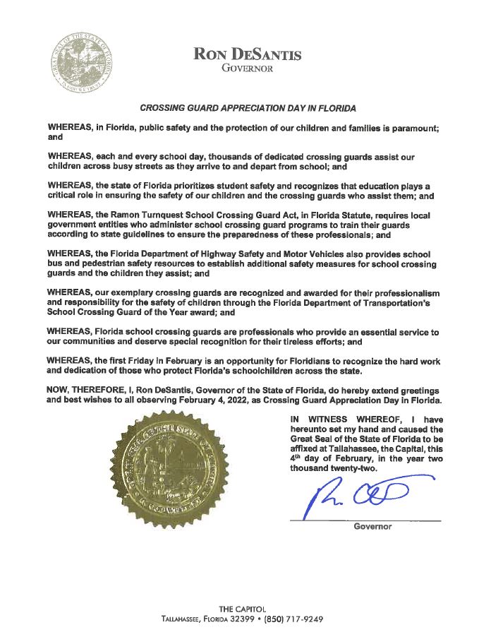 Governor Ron DeSantis has again recognized the contributions and importance of School Crossing Guards by signing a Proclamation declaring February 4, 2022 as Crossing Guard Appreciation Day in Florida.