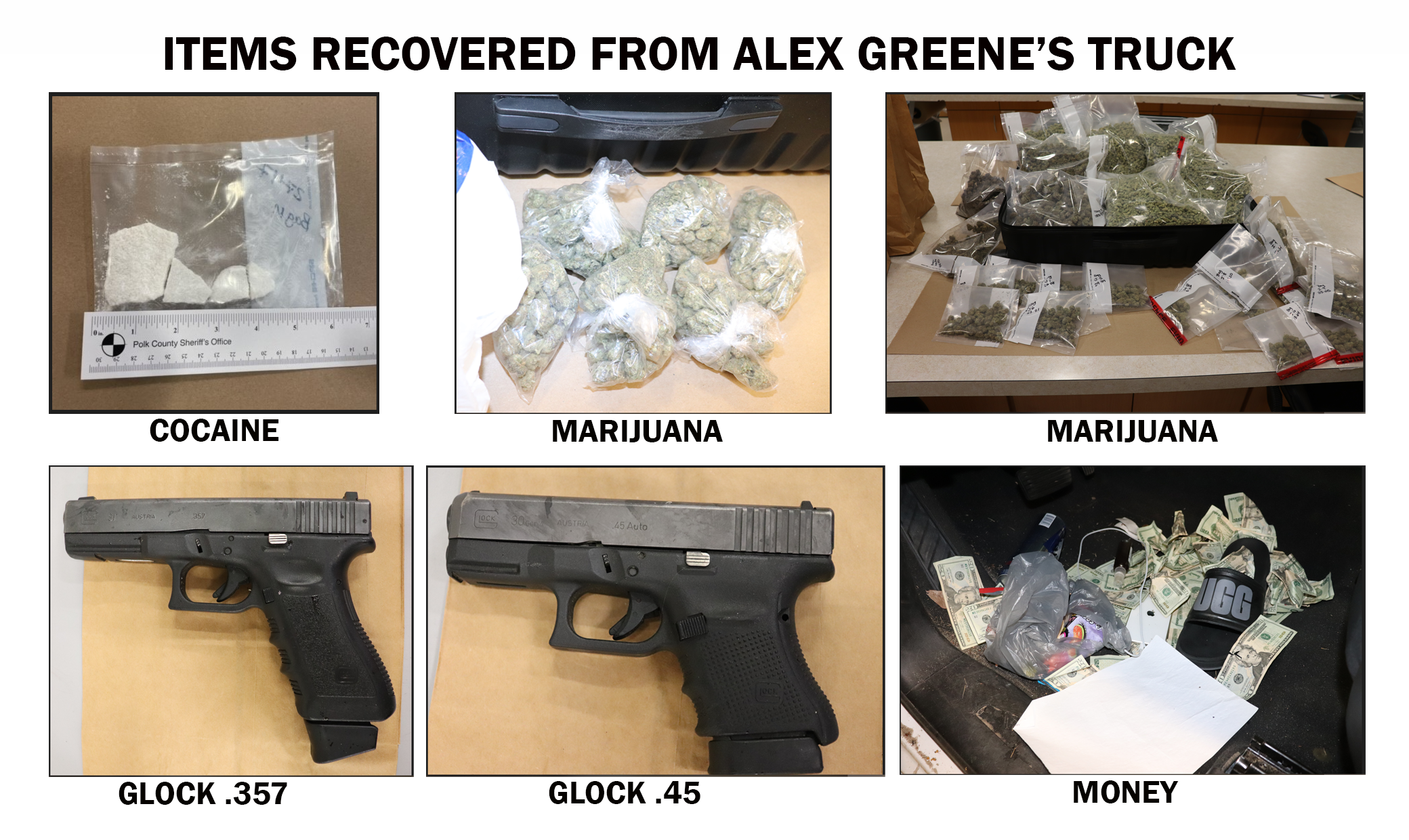During the search of the Chevrolet Silverado that Greene initially used to flee from agents from the Alcohol, Tobacco, and Firearms (ATF), Florida Department of Law Enforcement (FDLE), and Lakeland Police Department, the following were recovered: 28 grams of Cocaine, 4,178.9 grams of marijuana, a Glock .357 handgun, a Glock .45 handgun, and $2,813.00 in US currency. Greene was also in possession of $5,833 cash found on his person.